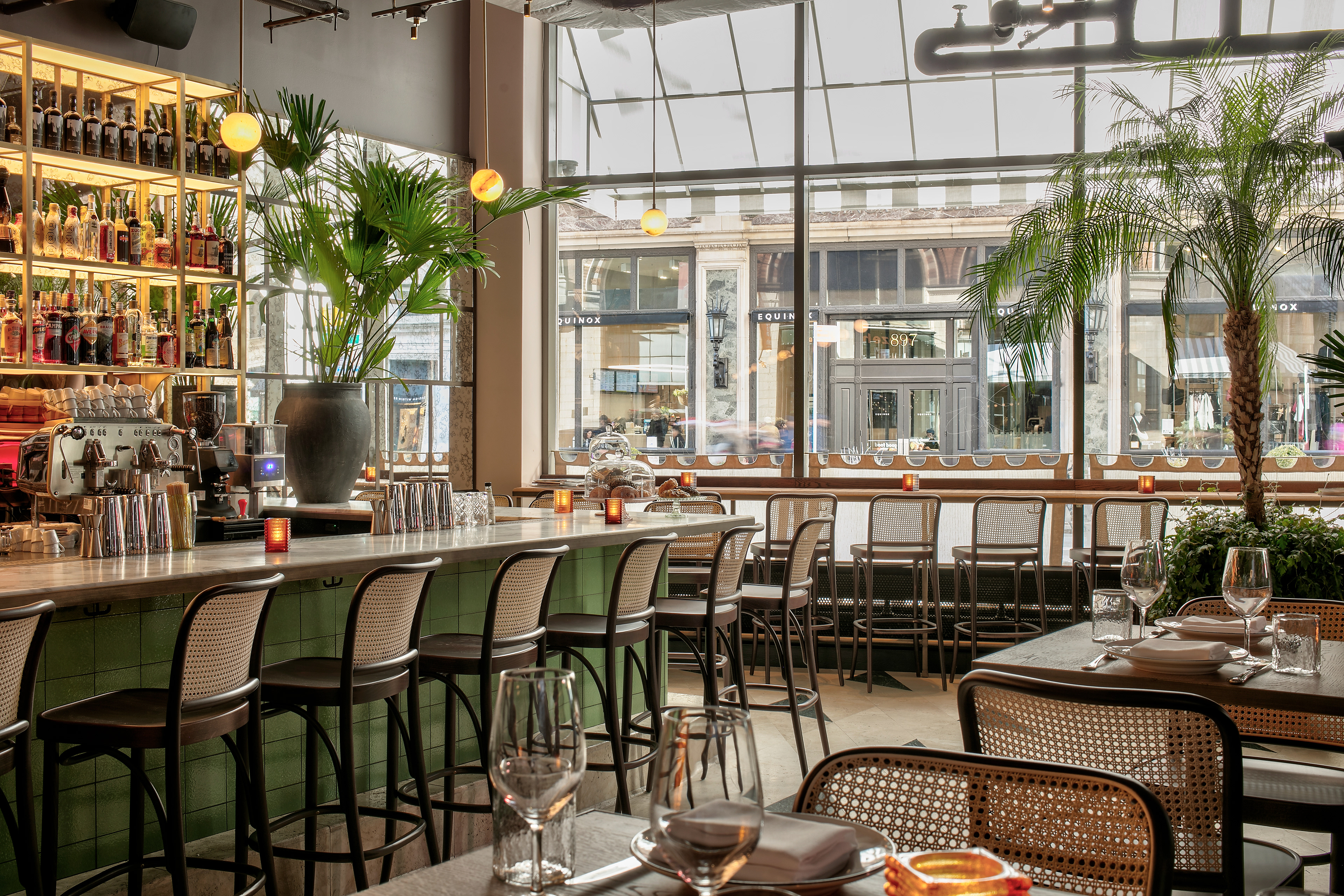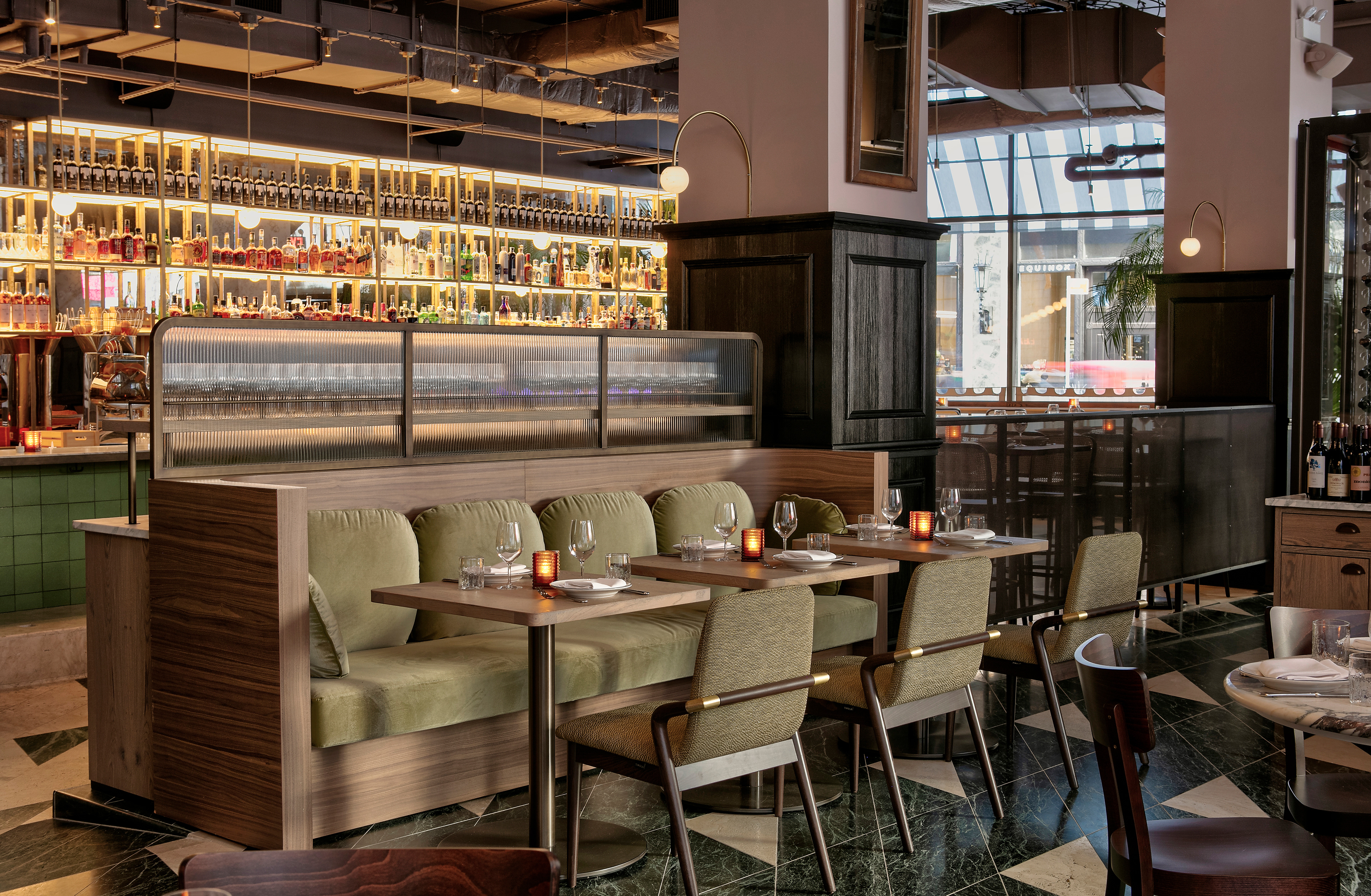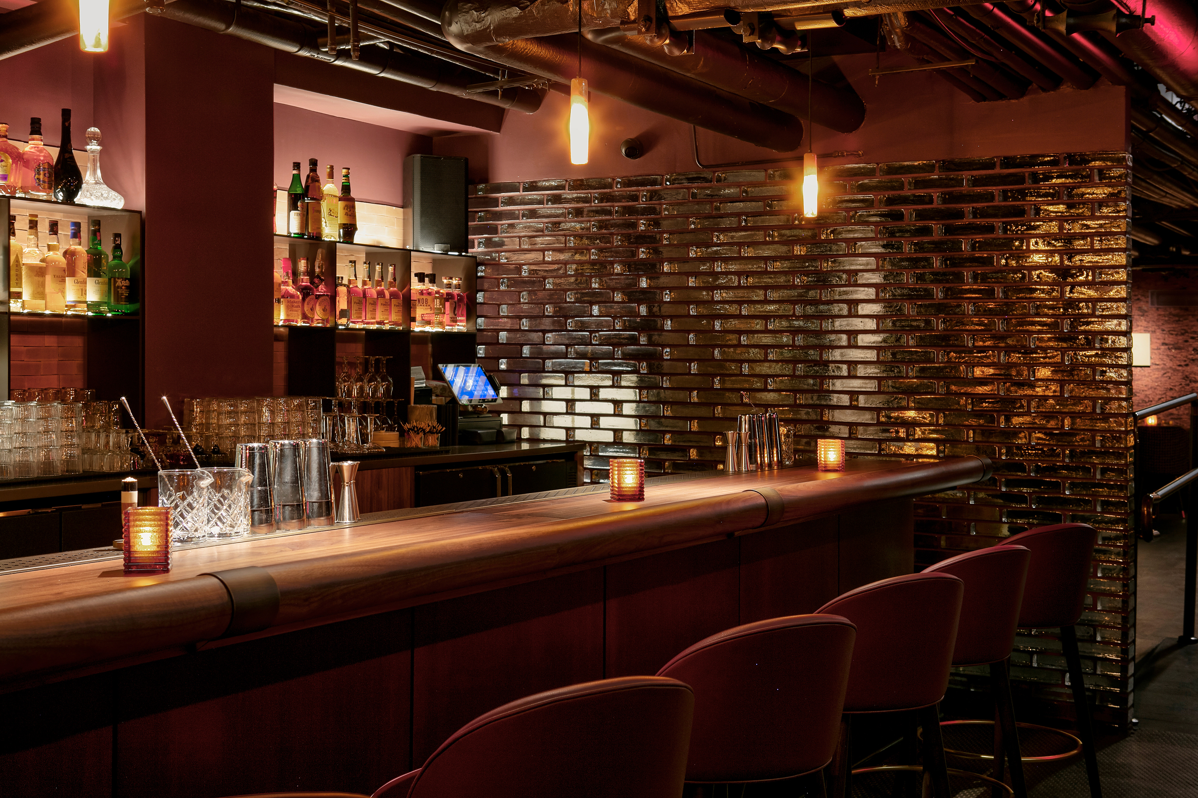 In the main dining area, refined illumination highlights the interplay of rich textures and materials, subtly reinforcing the venue’s homage to early modern eateries. The glow is inviting yet dynamic, echoing the cultural fluidity that defines Barlume’s identity.